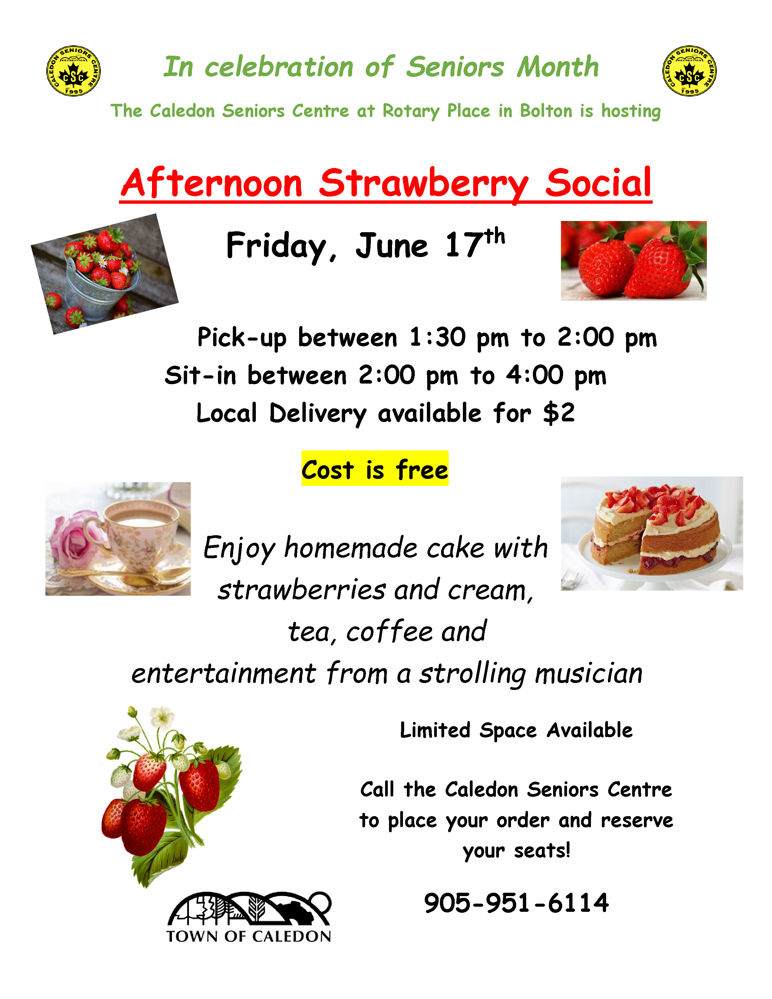 In celebration of Seniors Month and in partnership with the Town of Caledon, the Caledon Seniors Centre will be hosting a Strawberry Social & Entertainment Event from 2 p.m. - 4 p.m.