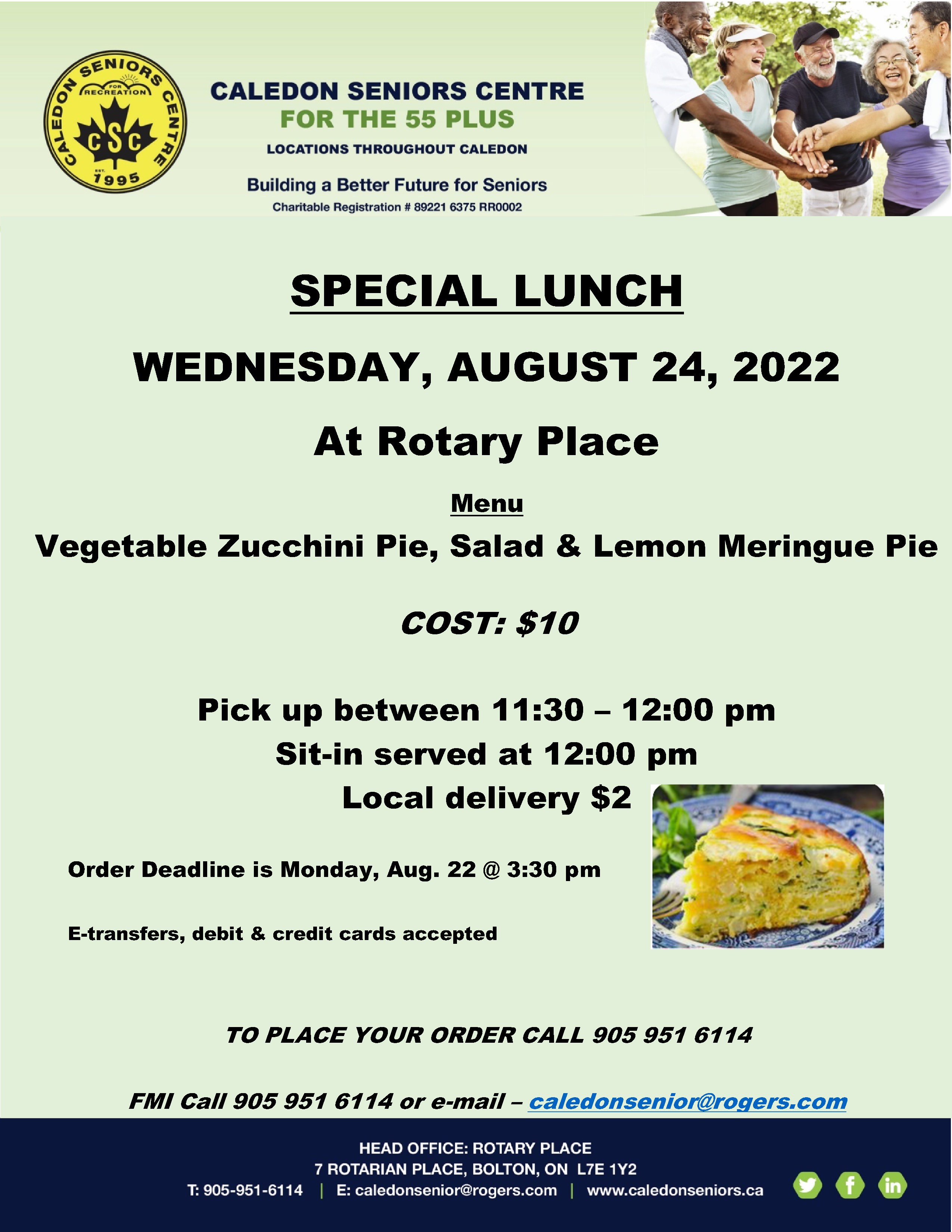 The Caledon Seniors Centre is having a Special Lunch on Wednesday, August 24, 2022 at Rotary Place in Bolton. The menu is Vegetable Zucchini Pie, Salad and Lemon Meringue Pie. Cost is $10.