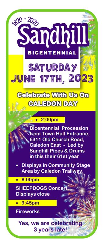 Come and join us for this wonderful celebration on Caledon Day. The Sandhill Bicentennial Procession from Town Hall Entrance, 6311 Old Church Road, Caledon East - Led by Sandhill Pipes & Drums in this their 61st year at 2:00p.m.