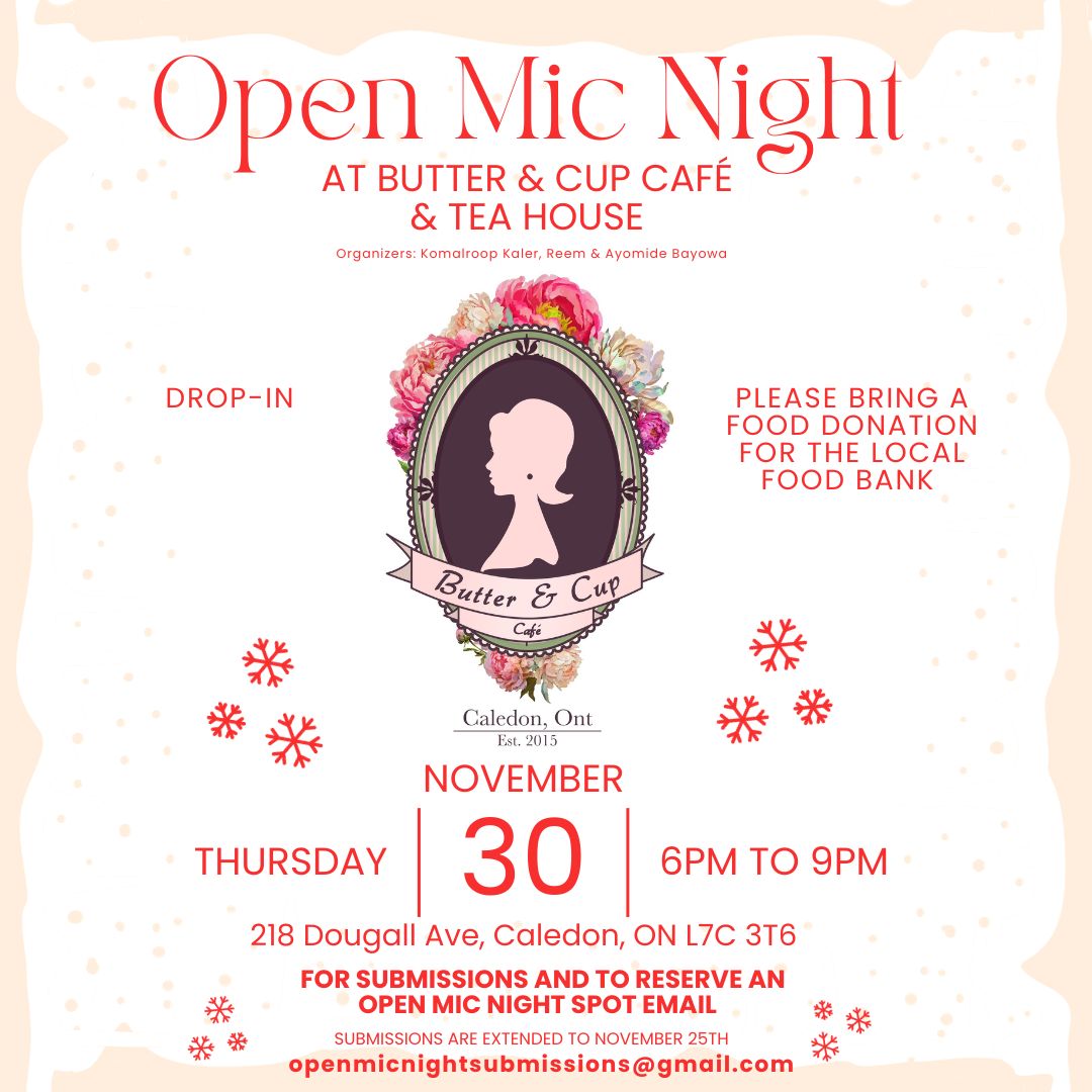 We are asking for a food donation for the local food bank. The warm, inviting atmosphere of Butter & Cup Café & Tea House sets the stage for an unforgettable night. To secure your place in the lineup or inquire about submissions, contact us at openmicnightsubmissions@gmail.com .