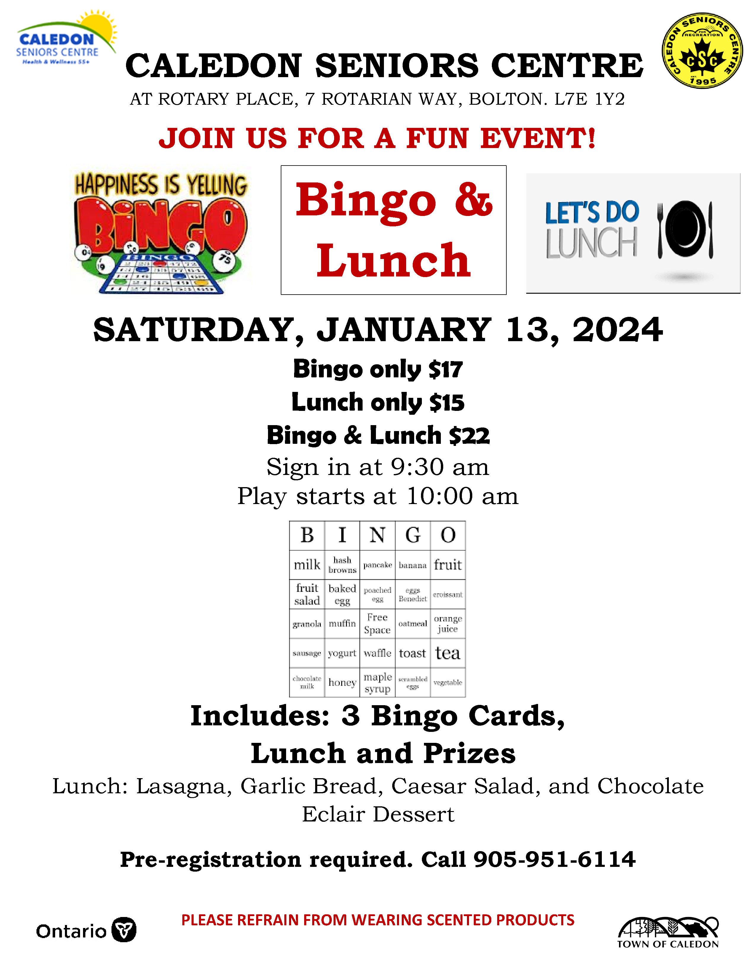 Join us at the Caledon Seniors Centre for this fun Bingo & Lunch event on Saturday, January 13, 2024.