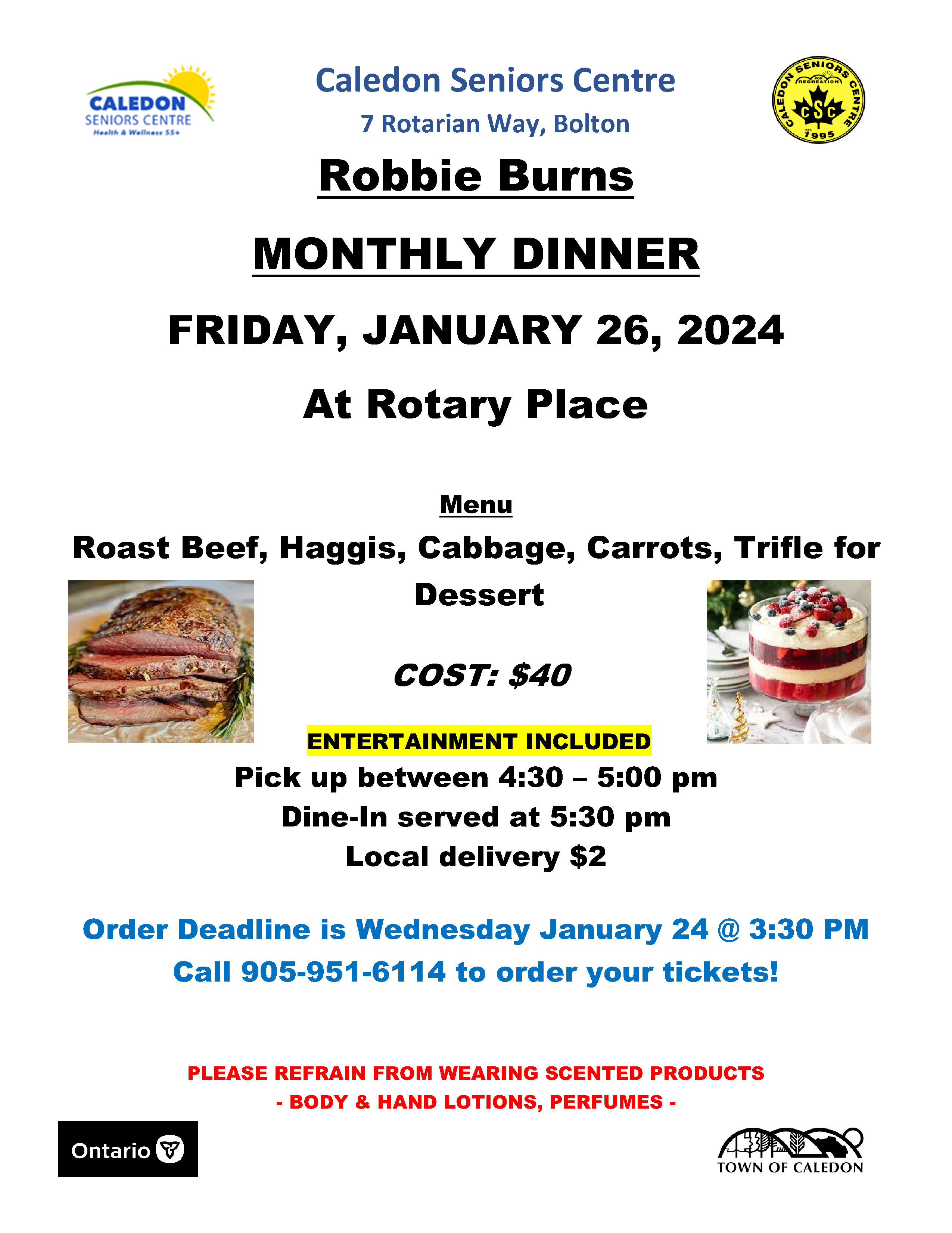Join us at the Caledon Seniors Centre at Rotary Place in Bolton for our Robbie Burns Monthly Dinner on Friday, January 26, 2024.