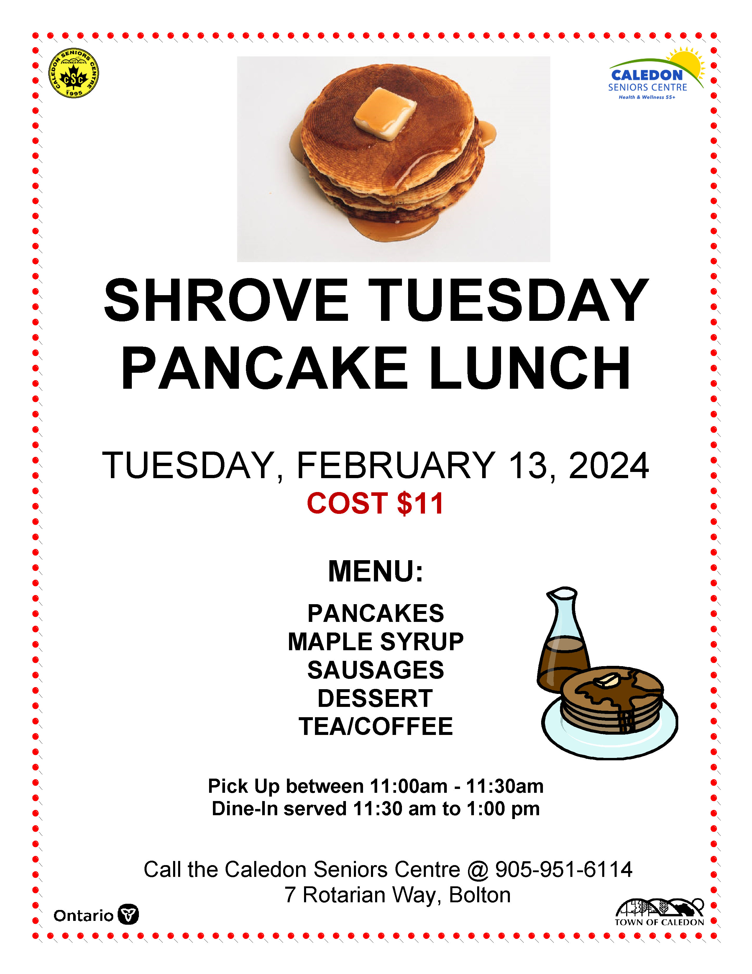 Join us Tuesday, February 13, 2024 at our Shrove Tuesday Pancake Lunch at the Caledon Seniors at Rotary Place in Bolton!