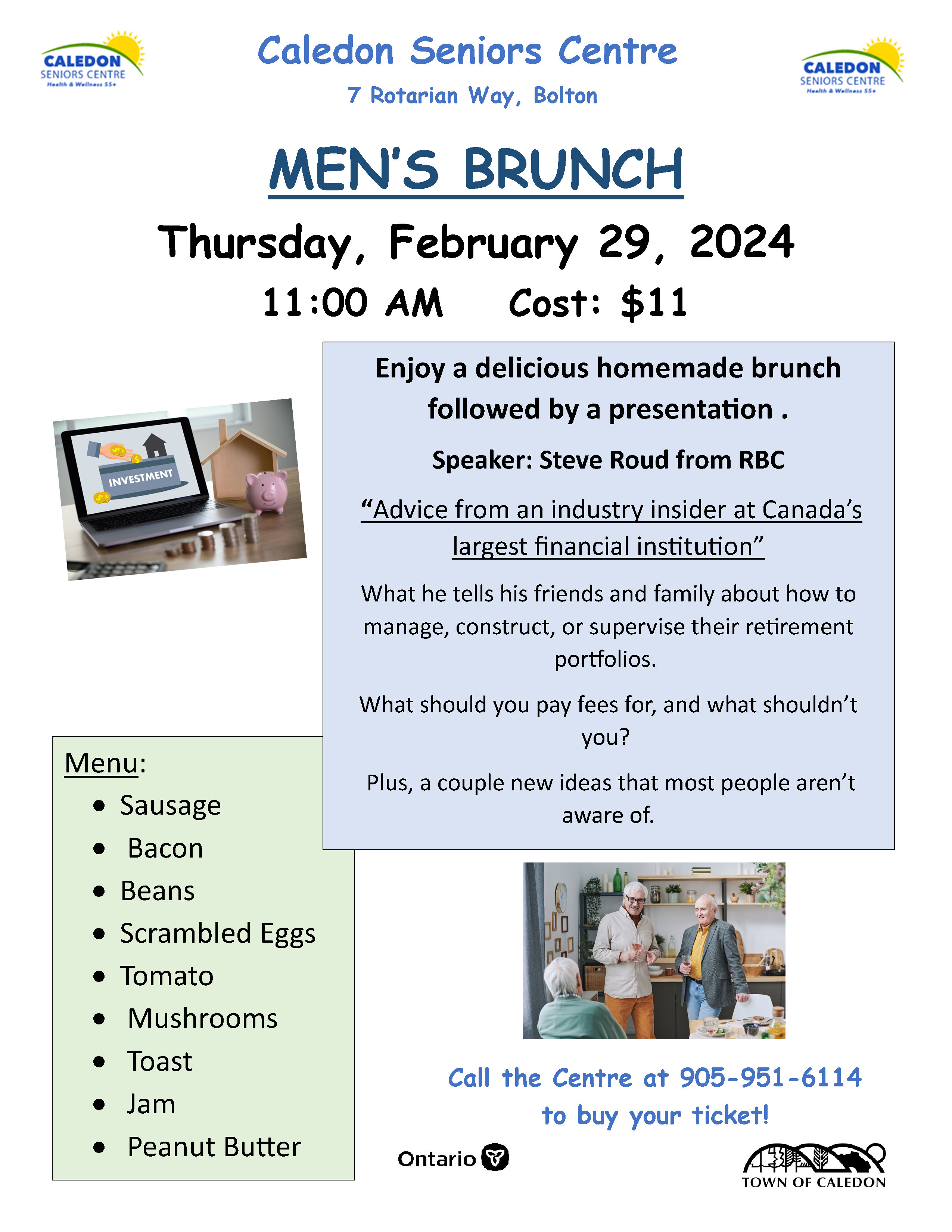 The Caledon Seniors Centre at Rotary Place in Bolton is hosting their first Men's Brunch on Thursday, Feb. 29, 2024!