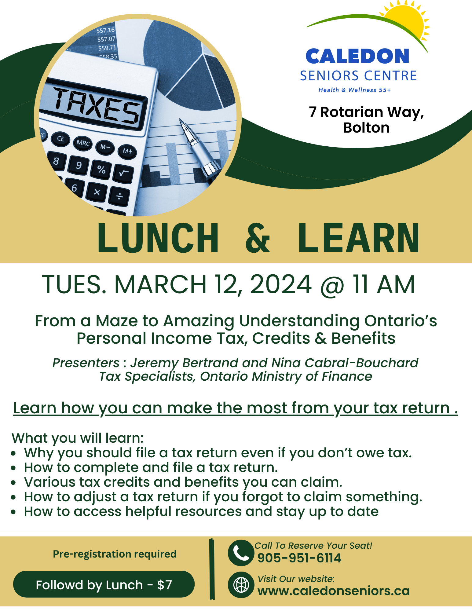 Join us at the Caledon Seniors Centre at Rotary Place in Bolton for our Lunch & Learn on Tuesday, March 12, 2024.