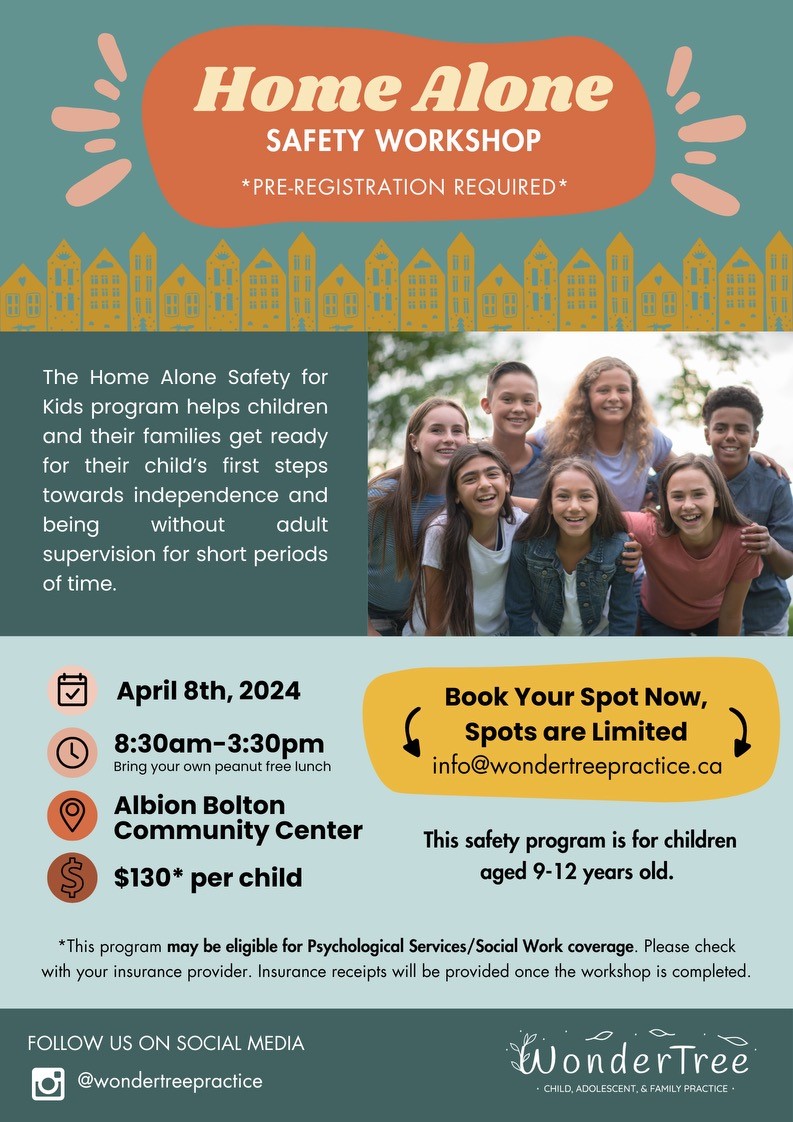 The Home Alone Safety for Kids program helps children and their families get ready for their child's first steps towards independences and being wtihout adult supervision for short periods of time. The program is intended for children aged 9-12 years old, and will be run by a clinical psychologist and developmental social worker. Key topics we will be going over are but not limited to: street safety, identifying "tricky" people, preparing a safe snack without adult supervision, online safety, fire safety, and basic first aid. Please email info@wondertreepractice.ca to register your child, the fee is $130 per child and may be covered by insurance under psychological/social work services.