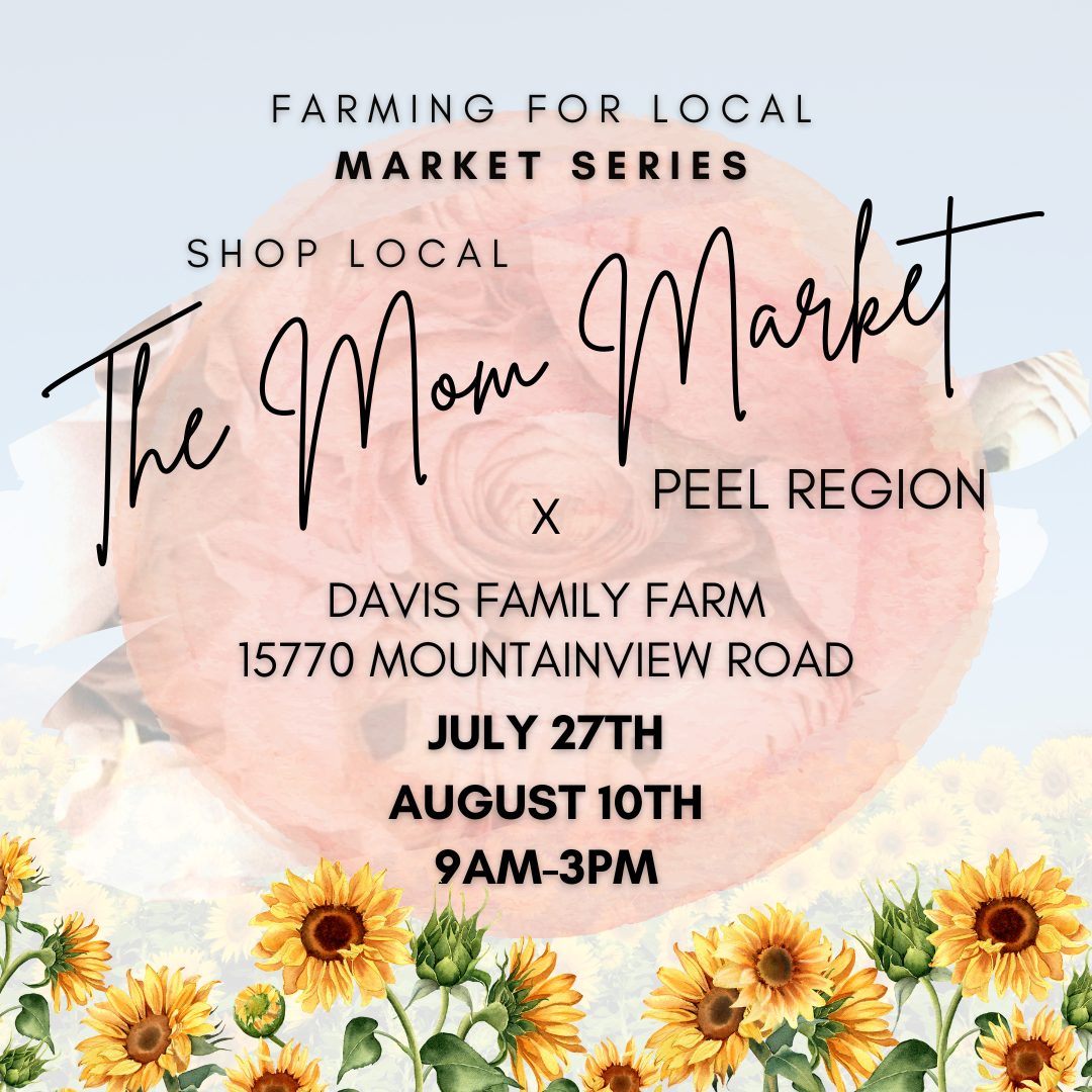 We are so excited to be launching our Farming For Local Market Series @davisfamilyfarmcaledon on July 27th and August 10th! Each event will have 40 outdoor tented vendors, a petting zoo, an ice cream truck, sunflower fields, and free parking! Visit our website to apply to be a vendor: https://themommarketco.com/peel-region.