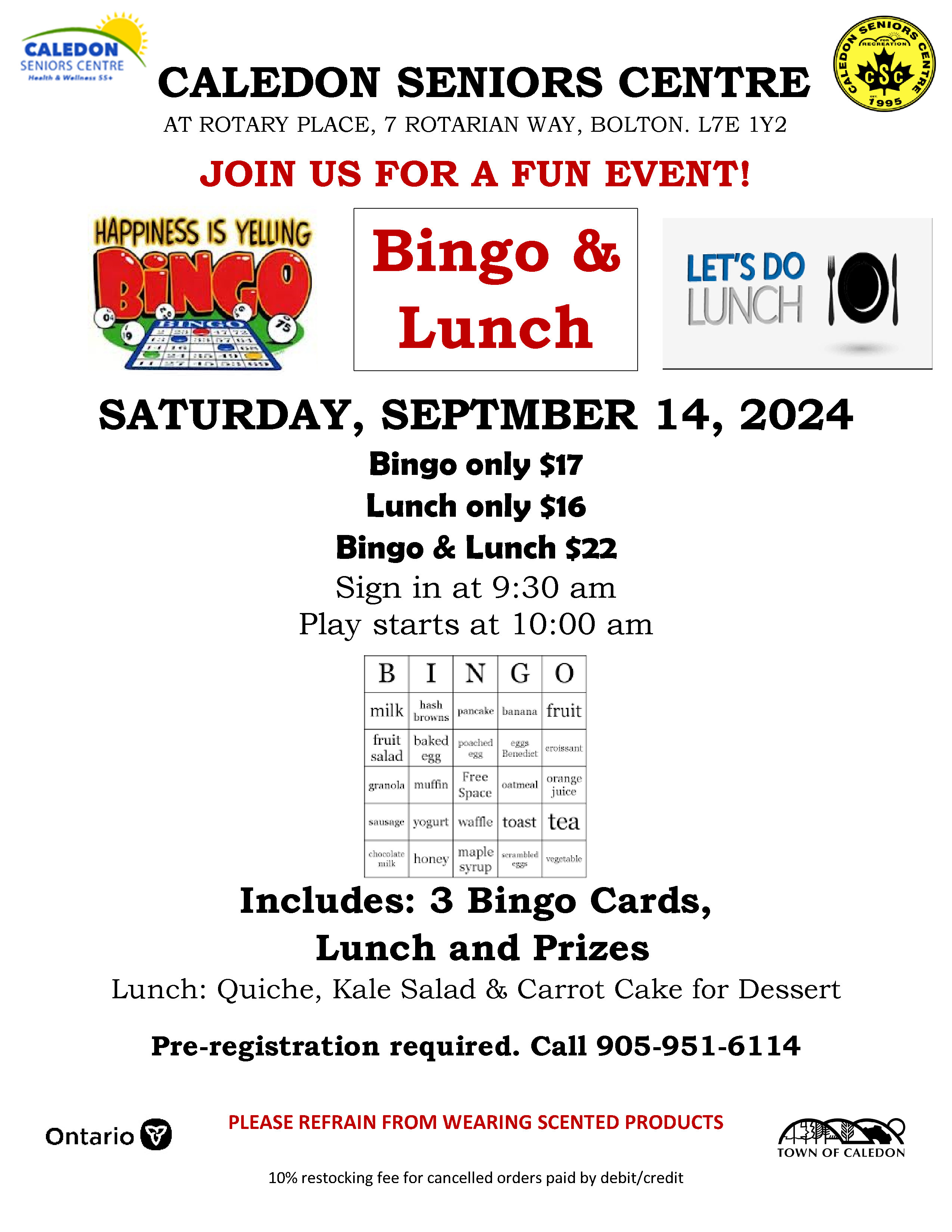 The Caledon Seniors Centre at Rotary Place in Bolton is hosting a Bingo & Lunch event on Saturday, Sept. 14, 2024!