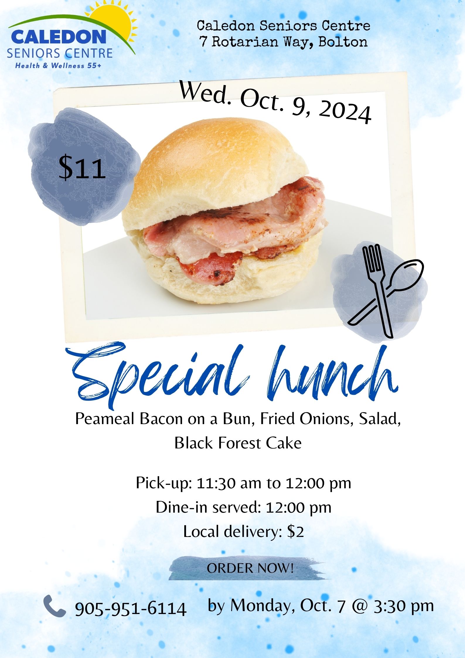 The Caledon Seniors Centre at Rotary Place in Bolton is having their Special Lunch on Wednesday, October 9 at 12:00 pm!