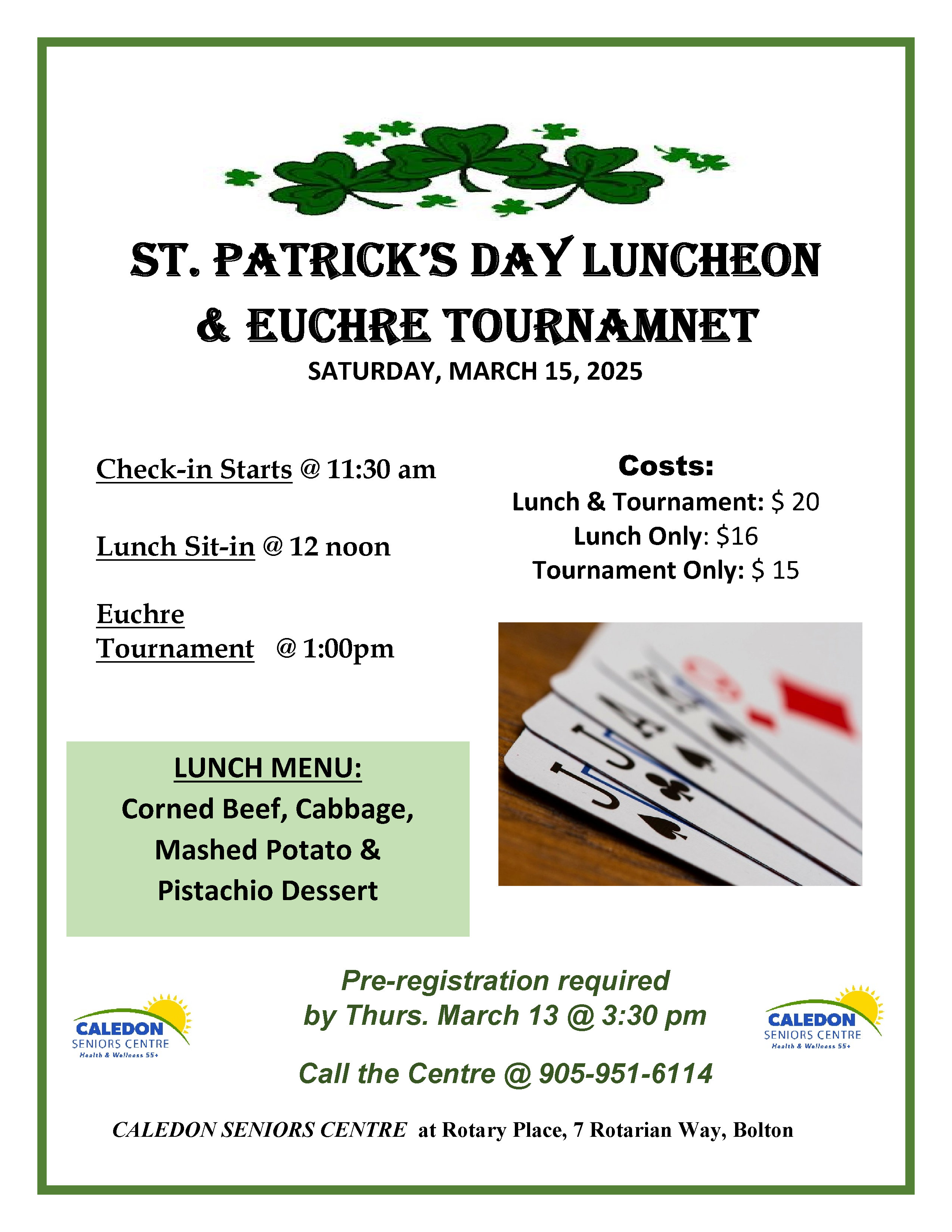 The Caledon Seniors Centre at Rotary Place in Bolton is hosting a St. Parick's Day Lunch & Euchre Tournament on Saturday, March 15, 2025.