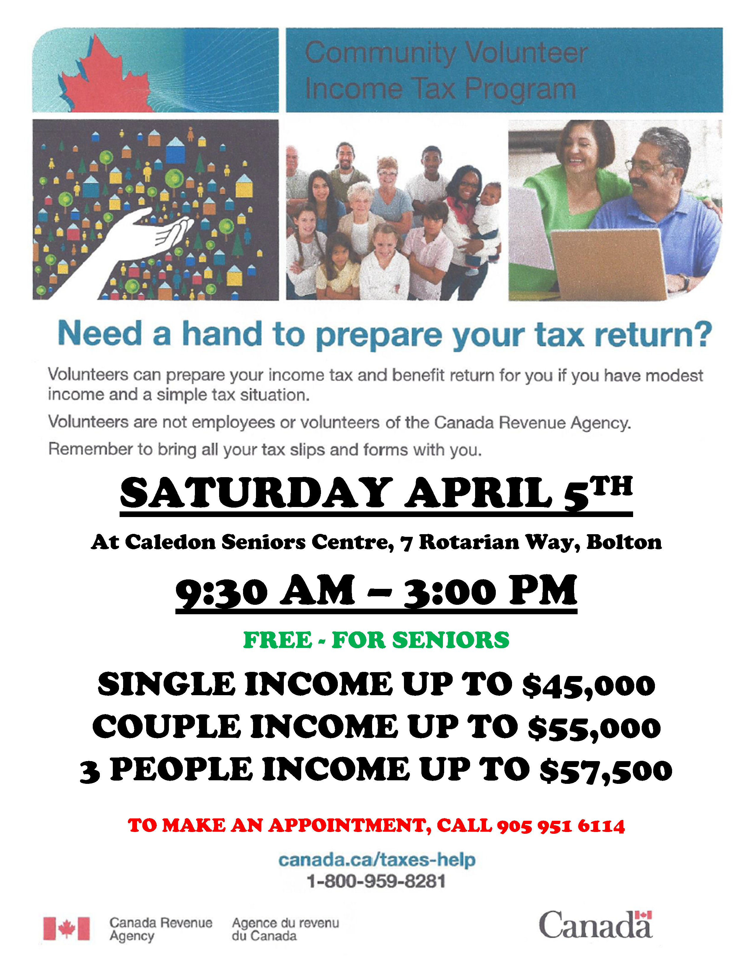 The Caledon Seniors Centre at Rotary Place in Bolton will be hosting a free Income Tax Clinic on Saturday, April 5, 2025.