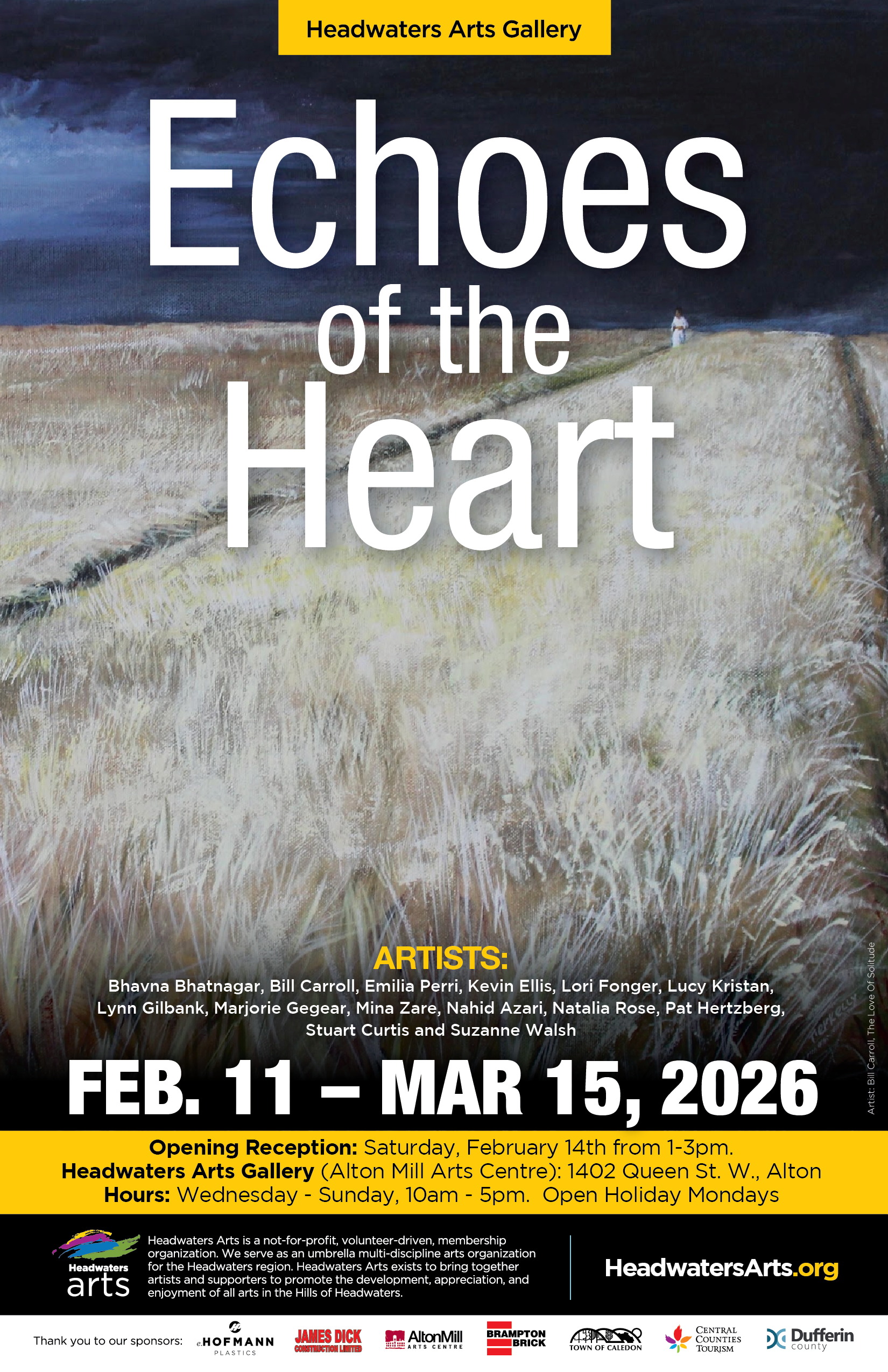 Meet the artists at the official Opening Reception to be held on Saturday, February 14, 2026, from 1-3 pm at the Headwaters Gallery in the Alton Mill Arts Centre, Alton, Ontario.